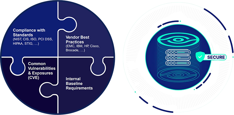 הפתרון מספק יכולת להעריך את מצב סיכוני הסייבר הספציפיים לאורך כל הרכיבים בדאטה סנטר ולקבל מפת סיכונים בסביבת האחסון והגנת הנתונים. הפתרון מאפשר סריקה, זיהוי ותיקון טעויות בקונפיגורציה ופגיעויות סייבר מדווחות על פני מאות שרתים, אחסון ומערכי גיבוי בדאטה סנטר. הפתרון יודע לסרוק את הרכיבים בהתייחס למספר רב של פרמטרים כגון: רגולצייה פנימית של הארגון, דיווחים על CVE’s, עמידה בתקנים (NIST, CIS, ISO, HIPAA ועוד), best practice של היצרן. הפתרון מספק מידע על ה-security posture ברמה גבוהה עם סיכונים המקוטלגים כ-low, medium, high לצד המלצות לטיפול ותיקון.